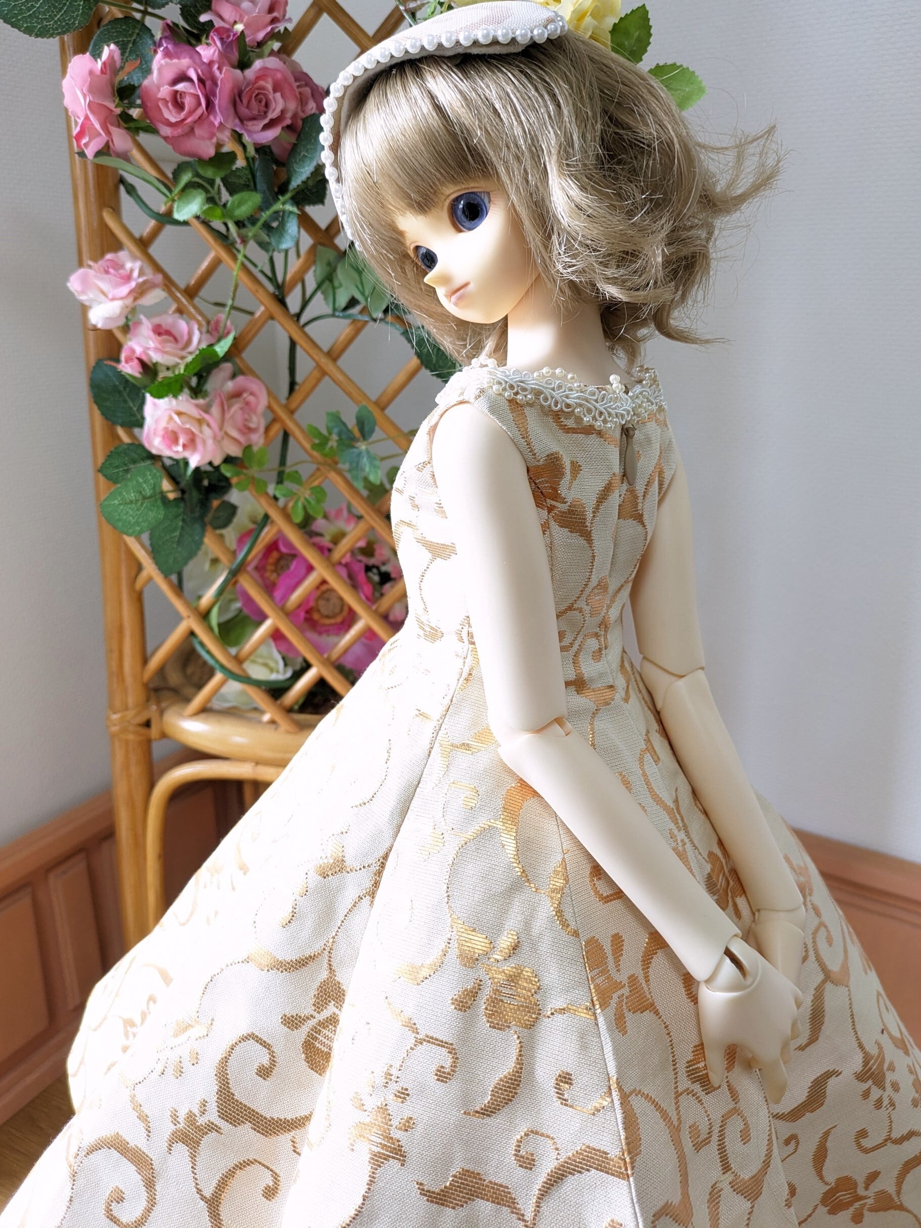 ローマの休日のヘップバーンが最後のシーンで着ていたドレスを意識してヘッドに飾る小さな飾りまで完璧なコーディネートで作ってみました